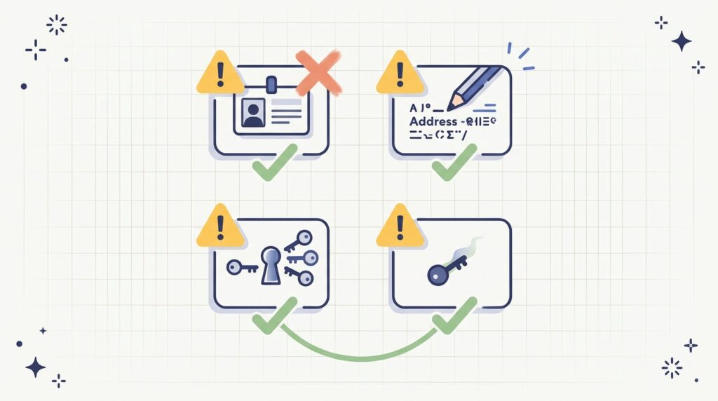 本人確認書類はどちらが早いか、住所表記はどこまで一致させるか、2段階認証はいつ・どう設定するか——これらは知っていれば数秒で判断できますが、知らないと差し戻しで1日待たされます。