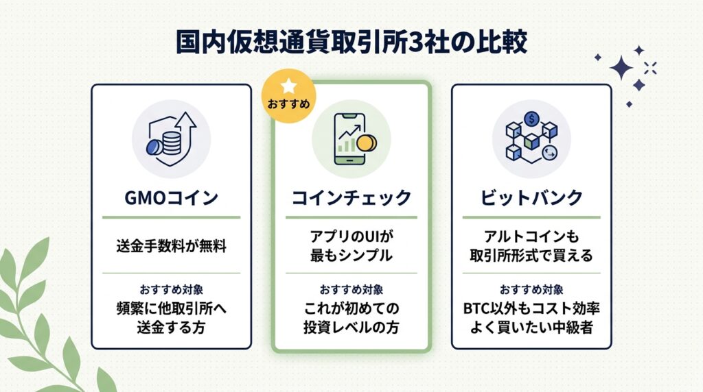 「他の取引所と何が違うの?」と気になる方に向けて、ざっくり比較しておきます。